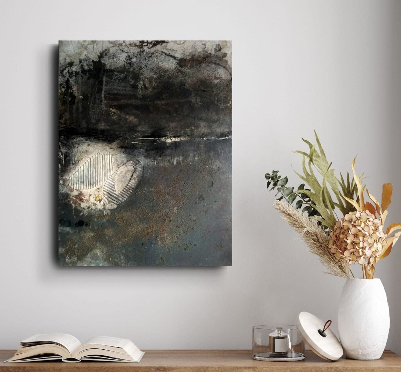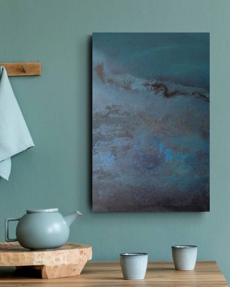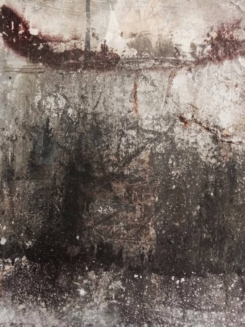 Acrílicos, óxido de hierro, tintas al alcohol y pintura en spray sobre lienzo intervenido.